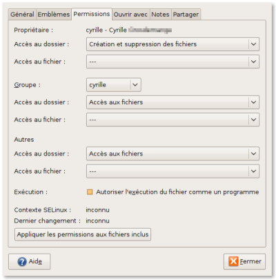 Sous Nautilus (Ubuntu), faites un clic droit sur un fichier ou répertoire puis choisissez propriétés. Rendez-vous dans l'onglet permissions.