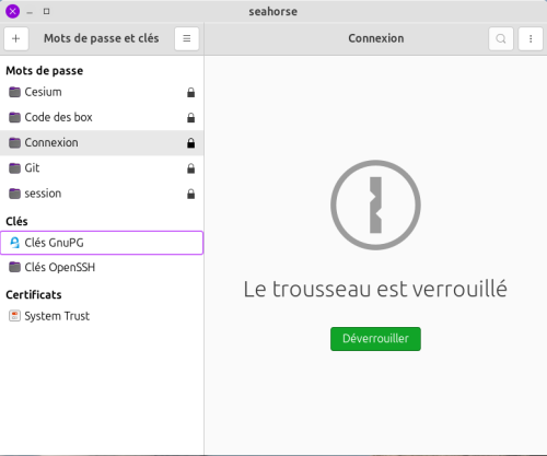 Il est installé par défaut dans Ubuntu. Pour l'installer sous d'autres variantes, il suffit d'installer le paquet seahorse.