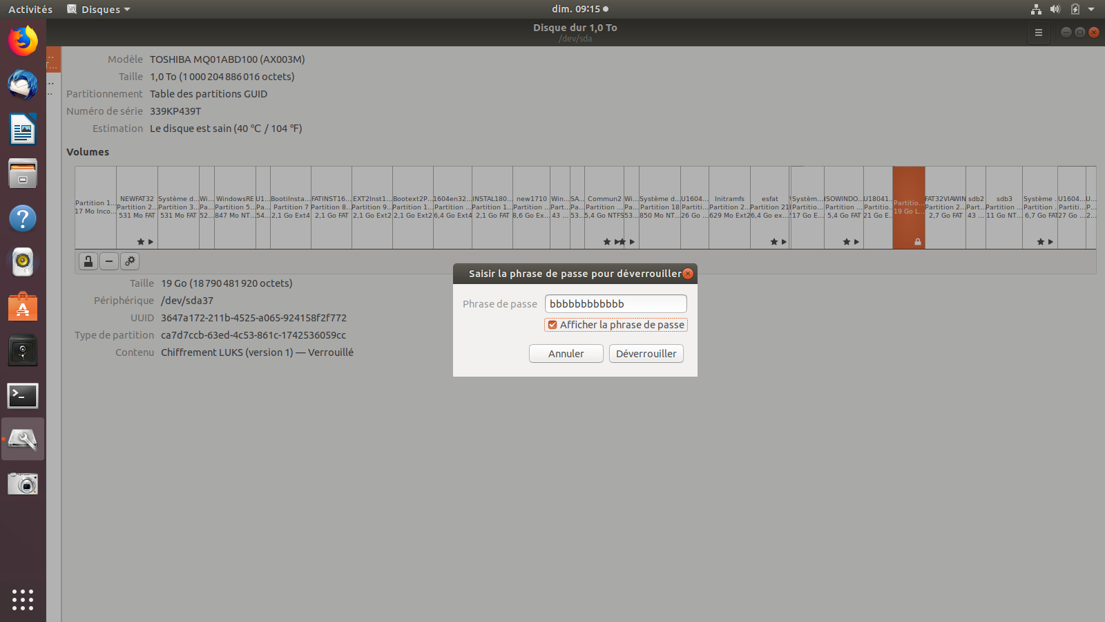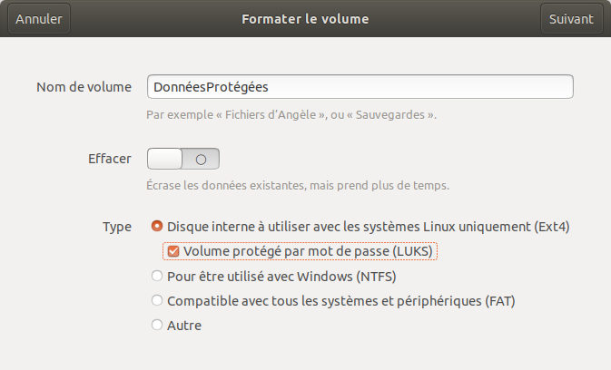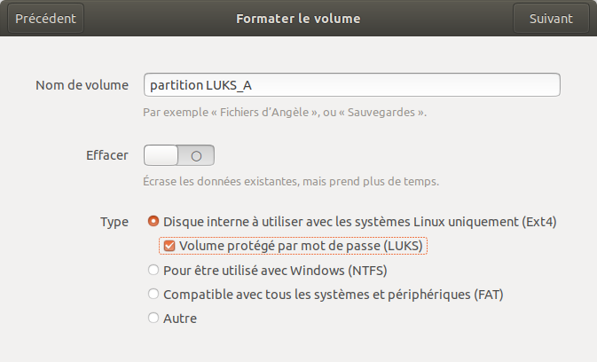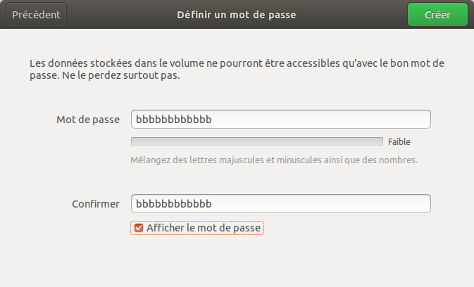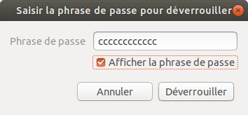 Un mot de passe sera demandé lors du montage de ces partitions. Il faut le choisir assez compliqué. La pratique montre que le logiciel ubuntu n'aime pas trop les caractères se frappant en aveugle à l'aide de deux touches. Ce mot de passe sert à "chiffrer" les données de la partition. Ce mot de passe n'a rien à voir avec celui demandé au moment de la connexion de l'utilisateur. Il ne faut donc ni le perdre, ni le divulguer. Toute personne décidant d'accéder à ces partitions avec une autre technique, lira des informations non compréhensibles. En clair les outils de récupération de données du style testdisk seront inefficaces.