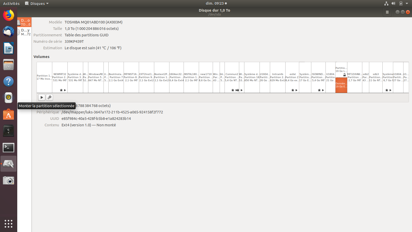 df -h | grep dm /dev/dm-1 19G 45M 18G 1% /media/a/DataExt4 /dev/dm-0 23G 5,7G 16G 27% /media/a/eb50bf05-2dc6-4513-8e73-29eb6cc1b713 /dev/dm-2 18G 45M 17G 1% /media/a/DataSécurisées a@a:~$ ls -als /media/a/DataSécurisées total 24 4 drwx------ 3 a a 4096 août 5 00:50 . 4 drwxr-x---+ 7 root root 4096 août 5 00:53 .. 16 drwx------ 2 root root 16384 août 5 00:50 lost+found echo "fichier" >/media/a/DataSécurisées/TEST.txt