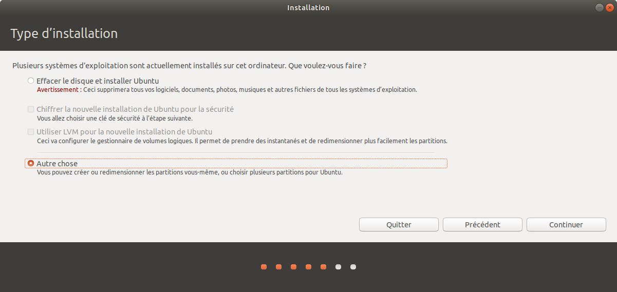 Il faut faire le choix "autre chose" comme souvent dit et pas les choix "effacer le disque"; "chiffrer" ; "utiliser le lvm"!