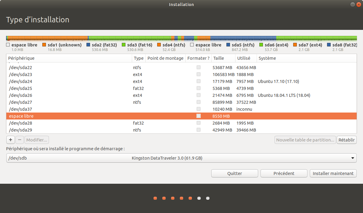 1) Lancer l'application disques et rechercher un espace disponible quelque part. Par exemple à cet endroit.