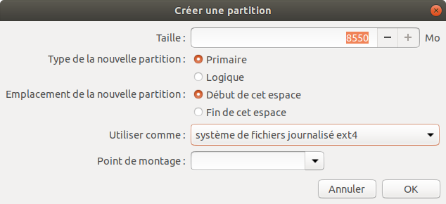 - Une partition primaire de boot standard. Format EXT4 . Taille 1 Go.