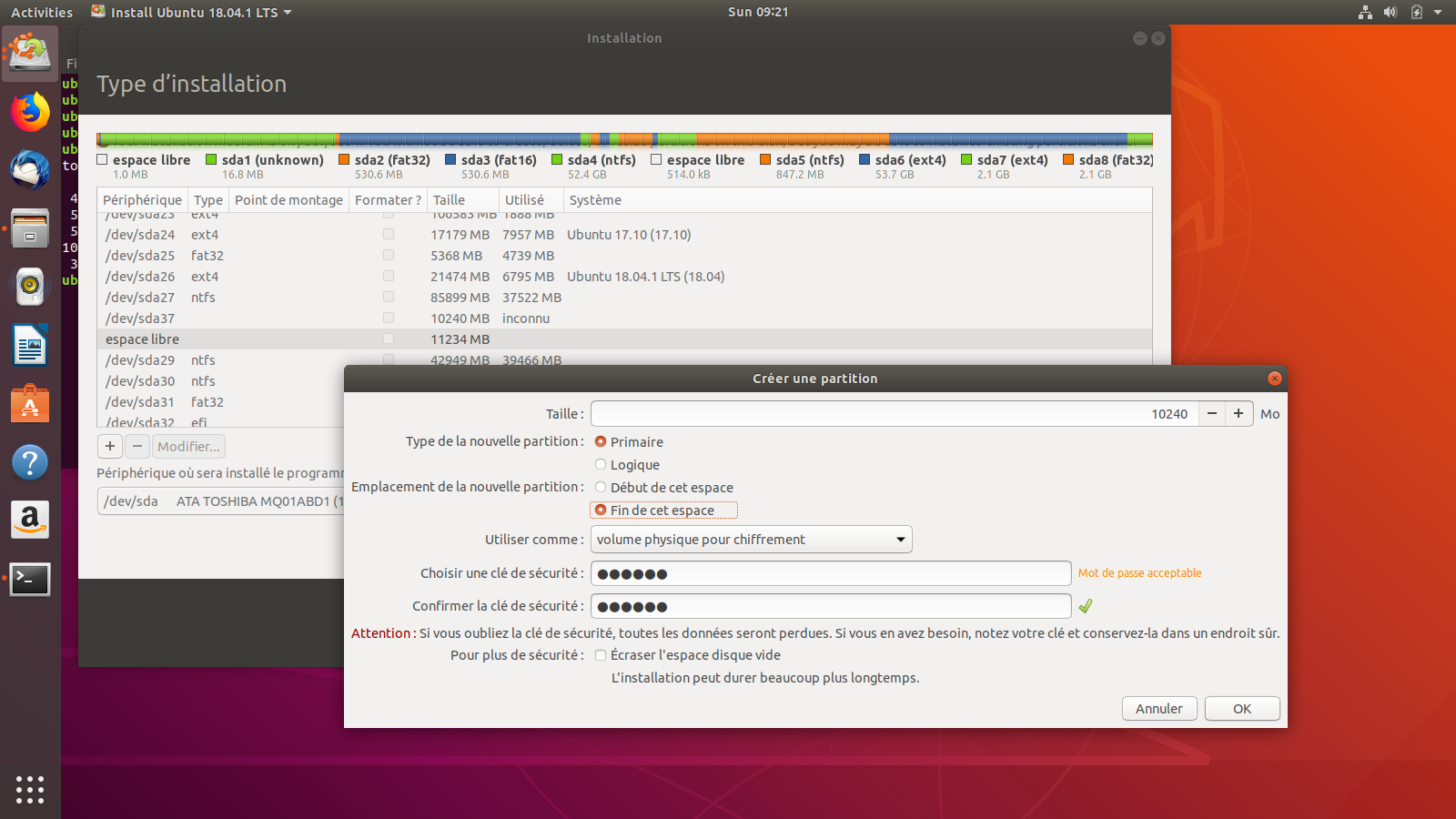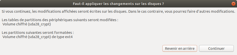 Notez bien qu'en version 18.04.1. il n'y a pas de partition /swap ni de partition /home dans une installation chiffrée.