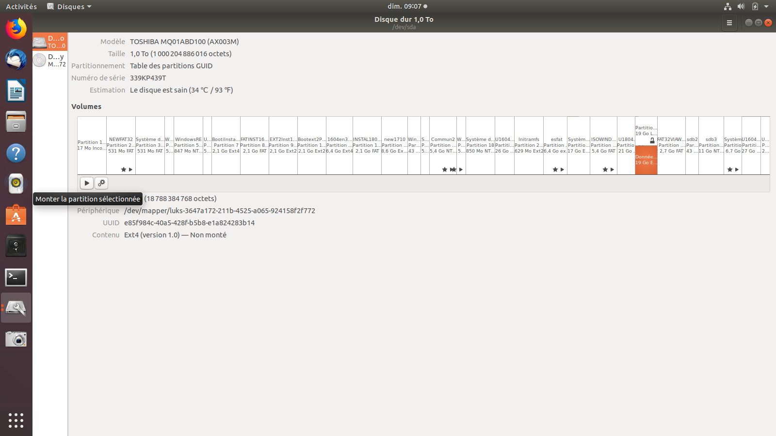 Souvenez-vous que cette partition ne pourra jamais être montée automatiquement via /etc/fstab car il y a une demande de mot de passe au montage. En fait, cela devrait être possible: il faudrait certainement mettre le mot de passe de montage de cette partition dans le fichier. Ce qui exigerait alors que l'OS soit aussi chiffré!!!!!