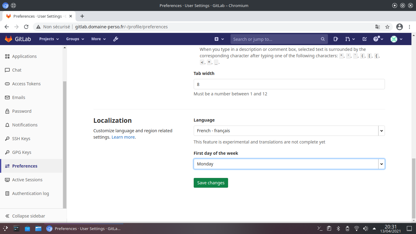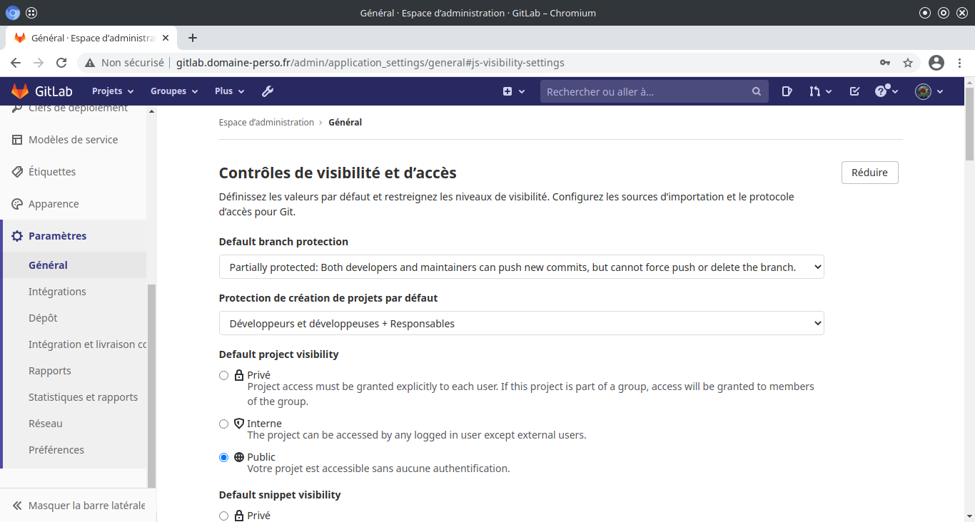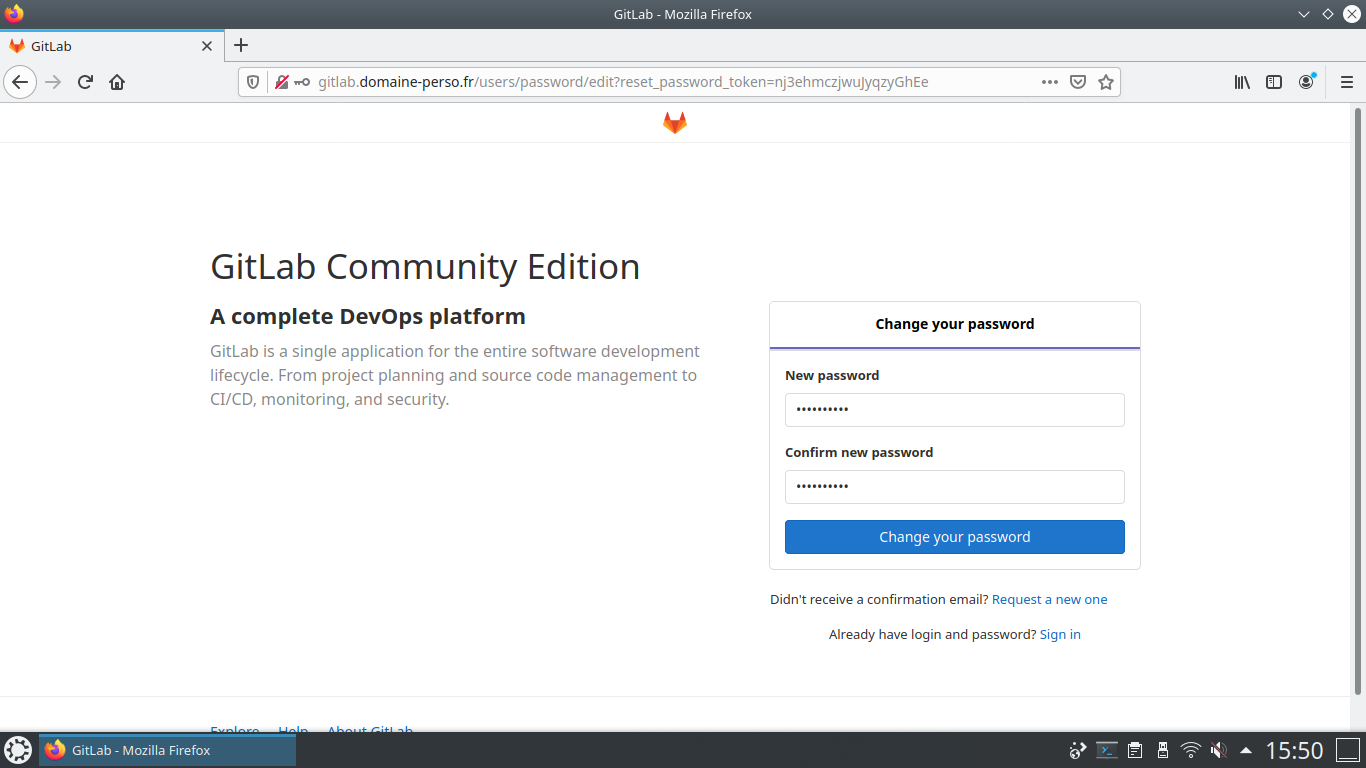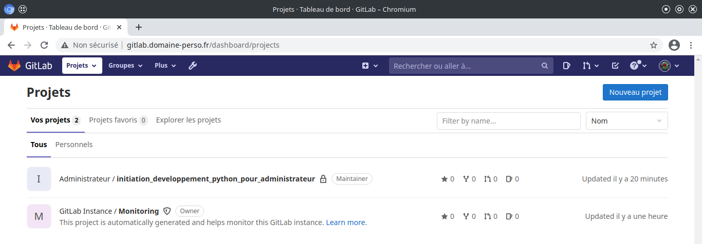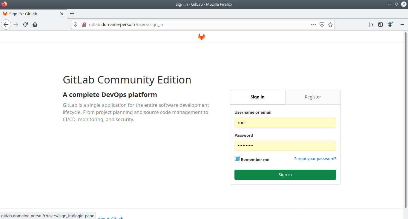 Saisissez dans un navigateur l’URL gitlab.domaine-perso.fr