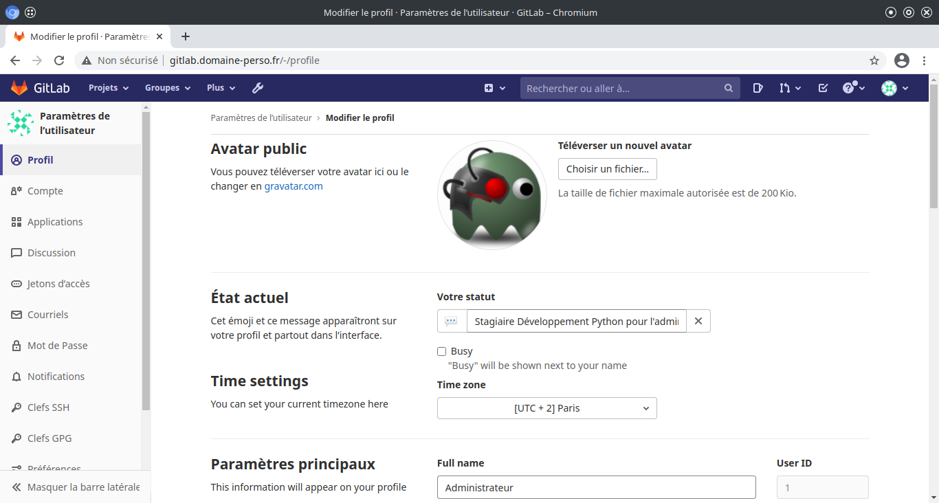 Changez l'icone du site Gitlab, renseignez le statut de l'administrateur du site, la zone de temps pour votre localité, le nom du compte administrateur, etc.
