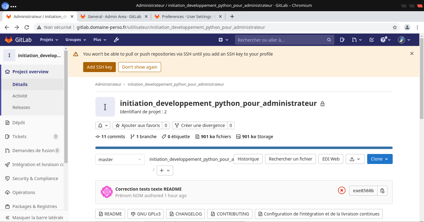 utilisateur@MachineUbuntu:~/gitlab$ wget https://packages.gitlab.com/gitlab/gitlab-ce/packages/ubuntu/focal/gitlab-ce_14.1.3-ce.0_amd64.deb/download.deb utilisateur@MachineUbuntu:~/gitlab$ sudo apt install git ; sudo EXTERNAL_URL="http://gitlab.domaine-perso.fr" dpkg -i download.deb Paramétrer GitLab