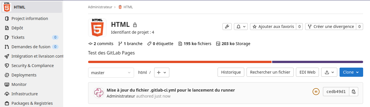 Supprimez le projet (Paramètres/Général/Advenced/Delete project), et nettoyez le runner de test «Runner Test Pages GitLab» du fichier /etc/gitlab-runner/config.toml.