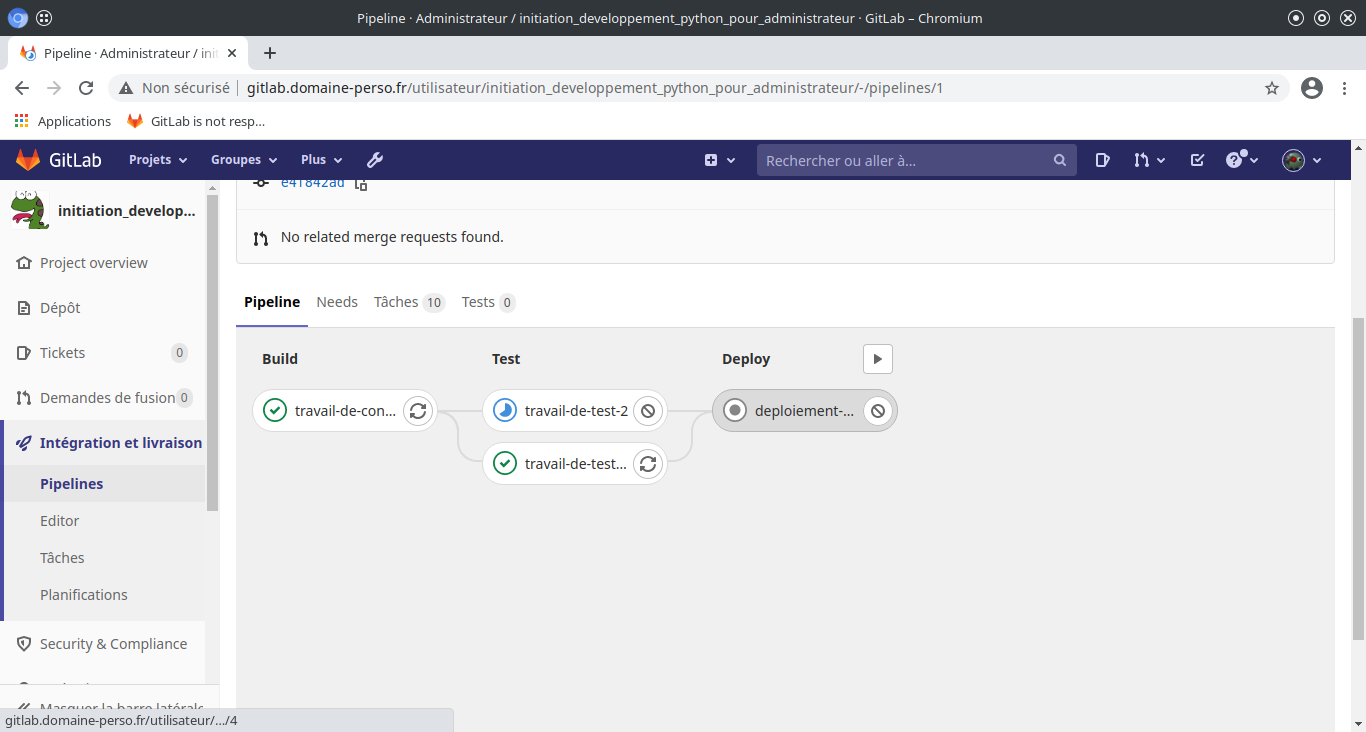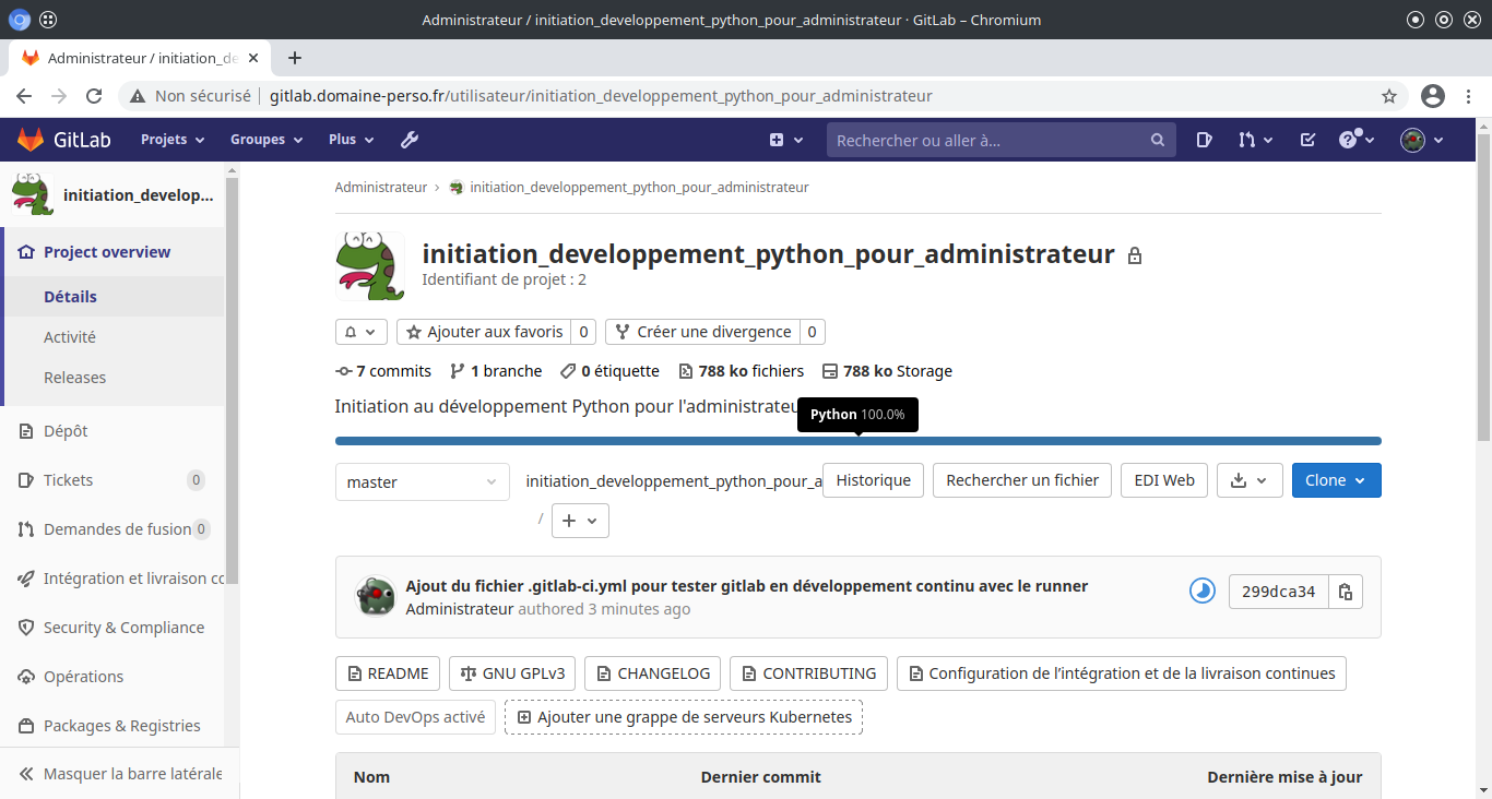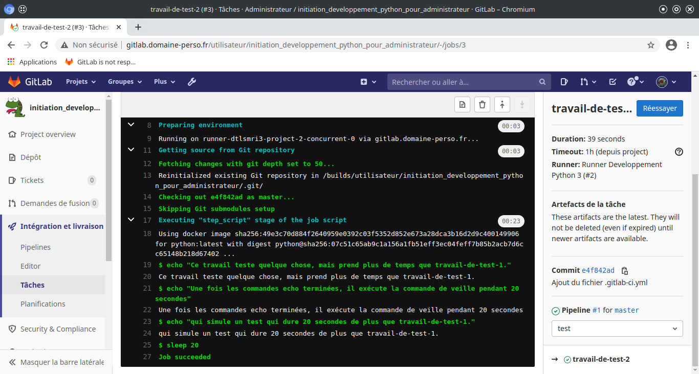 utilisateur@MachineUbuntu:~/repertoire_de_developpement$ git add . utilisateur@MachineUbuntu:~/repertoire_de_developpement$ git commit -m "Test du runner dans Gitlab" utilisateur@MachineUbuntu:~/repertoire_de_developpement$ git push