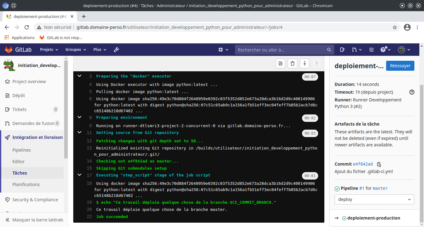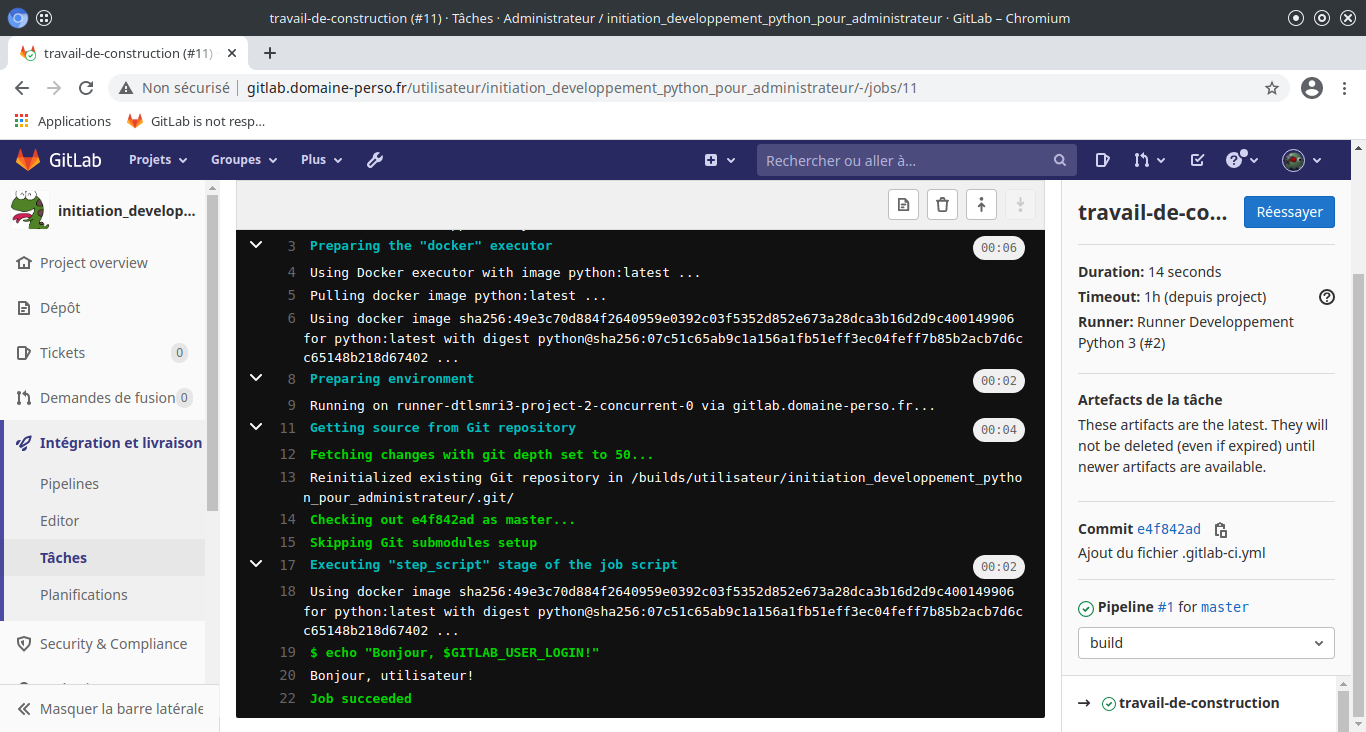 Enter the GitLab instance URL (for example, https://gitlab.com/): http://gitlab.domaine-perso.fr/ Enter the registration token: 9FfDsP_9Z2cXWi1Axwig Enter a description for the runner: [75d626bde768]: Runner Developpement Python 3 Enter tags for the runner (comma-separated): runner Registering runner... succeeded runner=Tzzfs5xc Enter an executor: kubernetes, custom, docker-ssh, shell, docker+machine, docker-ssh+machine, docker, parallels, ssh, virtualbox: docker Enter the default Docker image (for example, ruby:2.6): python:latest Runner registered successfully. Feel free to start it, but if it's running already the config should be automatically reloaded!