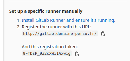 utilisateur@MachineUbuntu:~/repertoire_de_developpement$ docker run --rm -it -v /etc/gitlab-runner:/etc/gitlab-runner gitlab/gitlab-runner register Runtime platform arch=amd64 os=linux pid=7 revision=8925d9a0 version=14.2.0 Running in system-mode. Enter the GitLab instance URL (for example, https://gitlab.com/): http://gitlab.domaine-perso.fr/ Enter the registration token: 7YBLdSA9en4NMex5zyQy Enter a description for the runner: [75d626bde768]: Runner Test Pages GitLab Enter tags for the runner (comma-separated): runner Registering runner... succeeded runner=Tzzfs5xc Enter an executor: kubernetes, custom, docker-ssh, shell, docker+machine, docker-ssh+machine, docker, parallels, ssh, virtualbox: docker Enter the default Docker image (for example, ruby:2.6): alpine:latest Runner registered successfully. Feel free to start it, but if it's running already the config should be automatically reloaded!