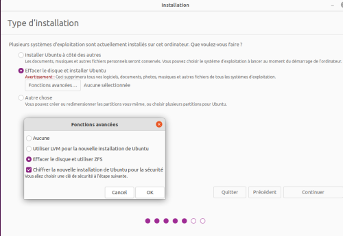 Pour créer une infrastructure ZFS lors de l'installation d'Ubuntu (ici Jammy 22.04), à l'étape du choix du Type d'installation, choisir Effacer le disque et installer Ubuntu et cliquer sur le bouton Fonctions avancées…. Sur la fenêtre ainsi ouverte sélectionner Effacer le disque et utiliser ZFS. Choisir éventuellement de Chiffrer la nouvelle installation, puis OK → Continuer.