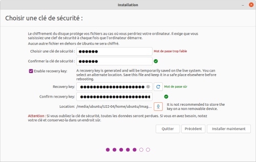 Dans le cas d'une installation chiffrée, un formulaire permet d'entrer sa clé de chiffrement (le mot de passe qu'il faudra entrer à l'ouverture de chaque session) et sa clé de récupération (recovery key). Vous devriez être en mesure de vous souvenir du mot de passe, mais il est impératif de noter ces informations, et particulièrement la clé, idéalement au moyen d'un gestionnaire de mots de passe.