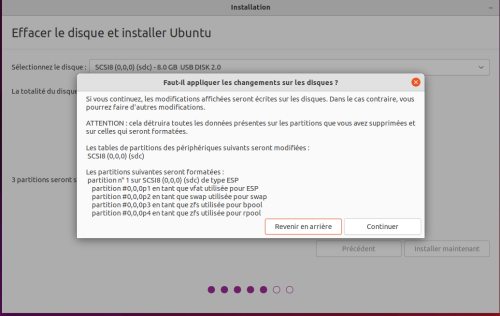 Il est aussi possible d'installer certaines versions d'Ubuntu directement sur une structure ZFS. Cette méthode est parfois proposée par l'installateur d'Ubuntu :