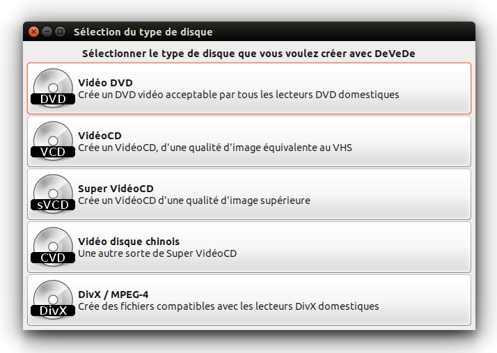 DeVeDe est une application de création de DVD et CD vidéos lisibles par des lecteurs de salon (DVDfilms, VCD, DivX,…). Il est très simple à utiliser et efficace. L'encodage est configurable (débit, compression, dés entrelacement…).