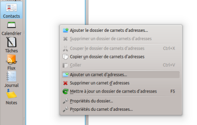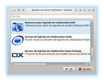 - La liste des carnets d'adresses : aussi appelés 'ressources'. On peut choisir l'endroit et le format dans lequel chacun d'eux sera stocké (local, distant, vCard, binaire, etc …)