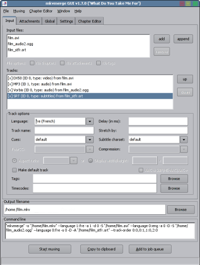 Supposons que nous ayons un fichier film.avi, avec une piste vidéo en DivX5 et une piste audio française en MP3. Nous avons, dans un fichier séparé, une deuxième piste audio anglaise en Ogg-Vorbis (film_audio2.ogg), ainsi qu'un fichier srt de sous-titres français (film_stfr.srt). Nous allons utiliser l'interface graphique de mkvmerge, mmg, pour créer notre fichier mkv.