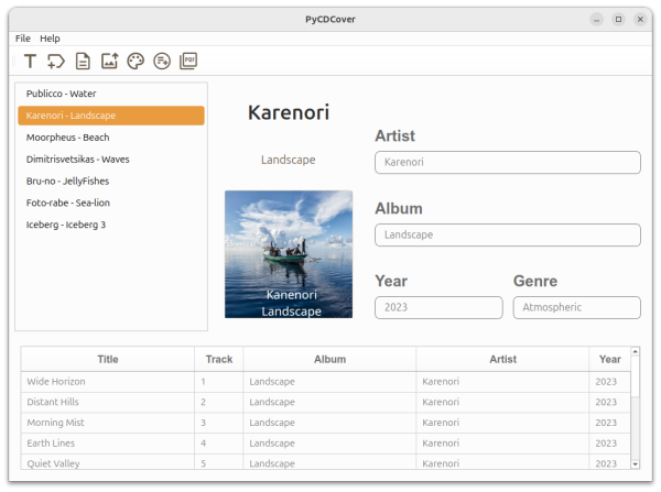 PyCDCover permet de créer des jaquettes (pochettes de disques). C'est un logiciel libre1). Il fonctionne sous GNU/Linux et Windows. Il est utilisé pour créer: