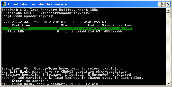 TestDisk présente sur l'écran suivant le partitionnement actuel du support.