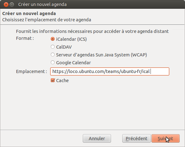 * Récupérer l'url du calendrier ubuntu-fr (ou une autre url personnalisée) et la copier dans le champs "Emplacement" :