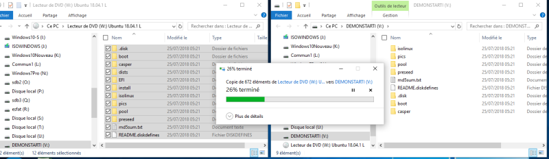 Monter les deux partitions et transférer le contenu de l'une dans l'autre. Cela devrait pouvoir se faire en mode graphique mais….. On peut lancer le gestionnaire de fichier. Sélectionner le fichier téléchargé, Double-cliquer pour visualiser son contenu. Faire la sélection de la totalité des fichiers et constater que l'action 'Copier' n'est pas actuellement proposée. Il est donc impossible de ´Coller' dans la partition FAT32 qui aura été préalablement montée par l'application ´Disques'.
